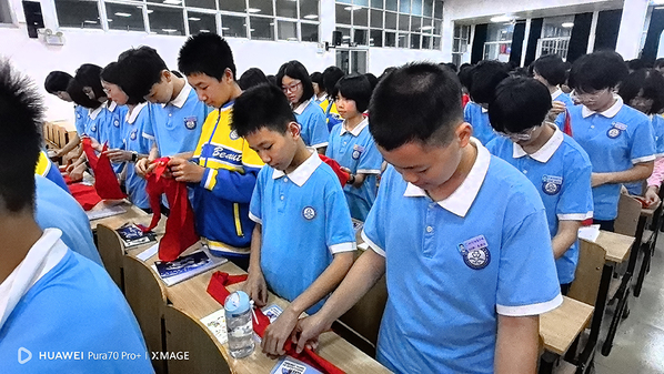 “别・少年先锋队” 环节将仪式推向高潮。学生代表 212班程绎宁同学发言:“红领巾是童年的勋章,更是梦想的起点。告别少先队,不是结束,而是责任的接力。” 随后,全体学生庄严起立,面向队旗行最后一次队礼,高唱《中国少年先锋队队歌》。当《少年》旋律响起,同学们小心翼翼摘下红领巾,折叠后珍藏于口袋。这一动作,既是对童年的郑重告别,更是对青春的庄严承诺。
