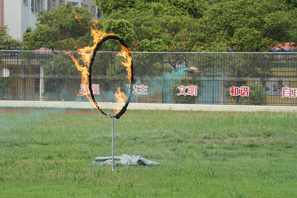 最令人屏息的要数两架无人机穿火圈的表演,它们灵巧地穿过悬于半空的燃烧火圈,机身携带的LED灯带在烟火中划出绚丽光轨。夕阳穿过旋转的螺旋桨,在跑道白线上投下跃动的光斑,这两架穿越烈焰的无人机在空中起舞,金属框架上迸溅的火星与观众的惊呼此起彼伏,将现场化作勇气与科技的狂欢舞台。