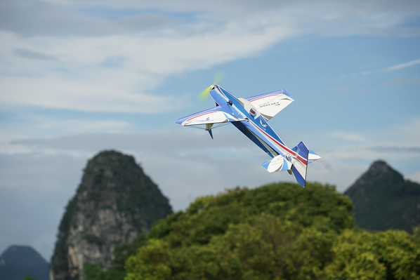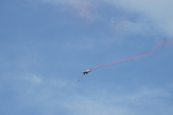 随着倒计时的停止,"歼10"战机的凌空展翅将气氛推向高潮。这架采用军绿色涂装的航模如同利剑出鞘,带着锐不可当的气势直插云霄,时而以优雅弧线盘旋攀升,时而以近乎垂直的角度俯冲,在距地面十余米处突然拉起机头。当红色烟带从机尾喷涌而出,在蓝天里“写”下一个“∞”符号,将空气动力学的精妙化作可视的美学符号。