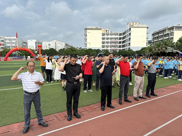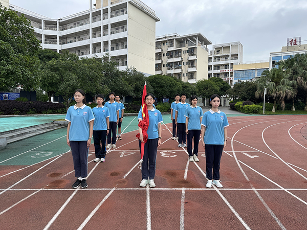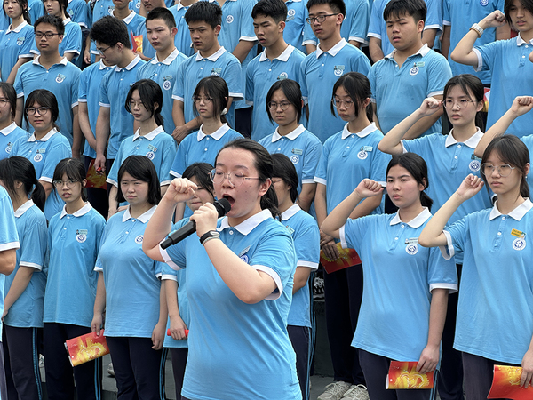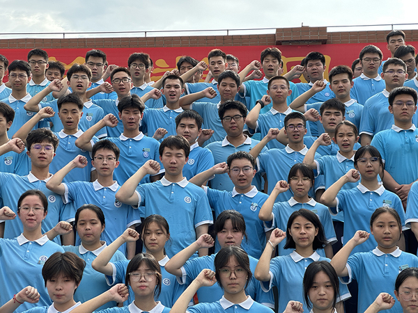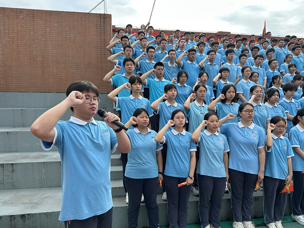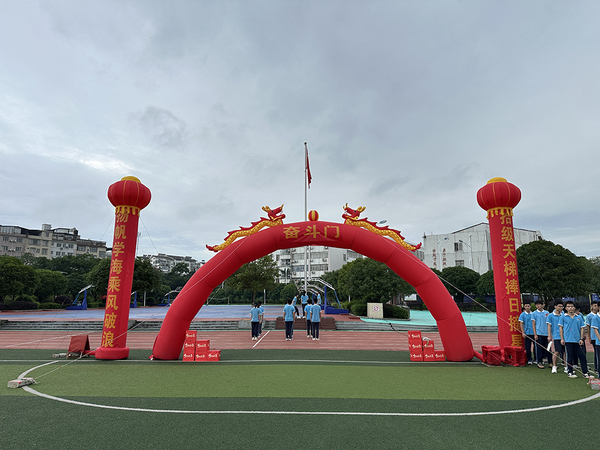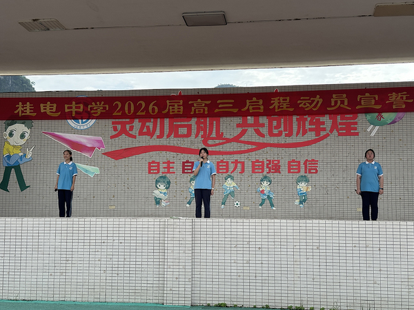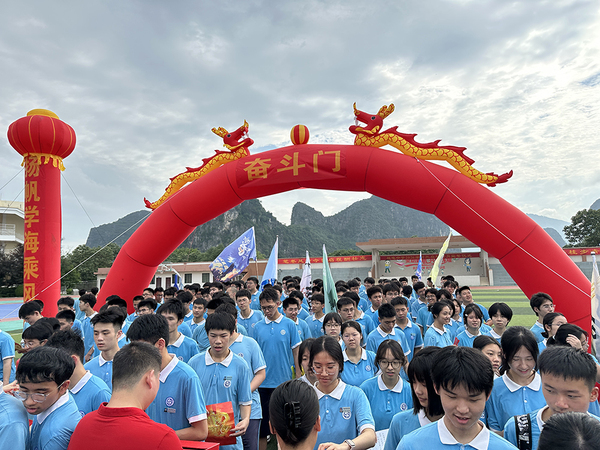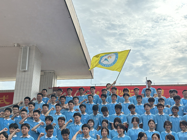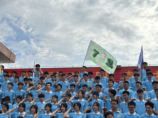 东曦既驾,嘹亮整齐的国歌声响彻在桂电中学校园,五星红旗冉冉升起,飘扬在湛蓝的天空中。伴随着升旗仪式的进行,桂林市桂电中学2026届高三启程仪式也于2025年6月16日拉开了帷幕。高三启程仪式分为七项议程:学生代表发言、教师代表发言、家长代表发言、全体高三教师宣誓、高三各班宣誓、75班学生代表唱响《看得最远的地方》、2026届高三师生共同奔赴“奋斗门”七项议程逐项进行。