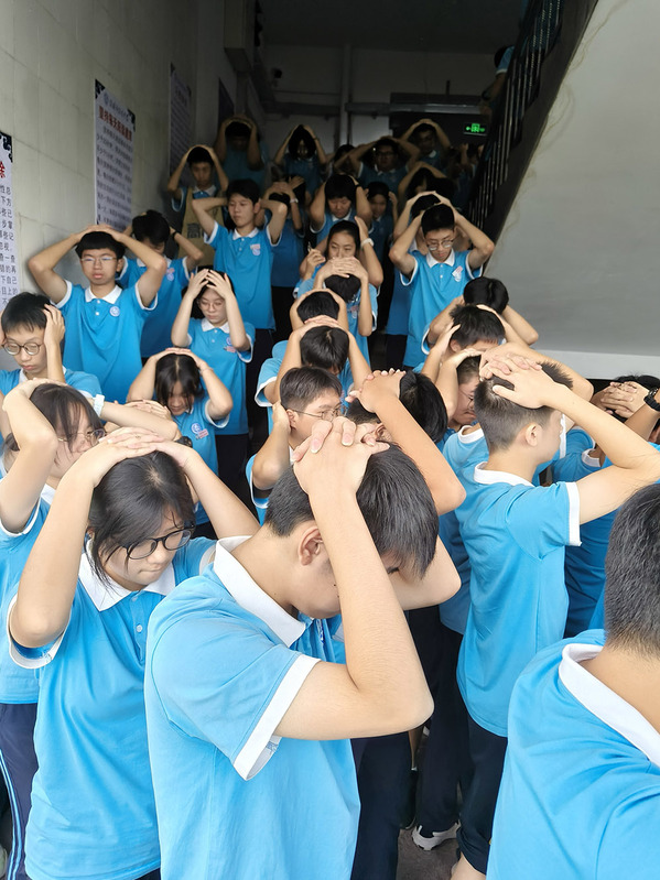 随着警报响起,全体师生迅速做出反应,学生们在老师的指挥下迅速进入演练状态。他们不慌不乱,服从安排,动作敏捷,双手护头,行动规范,按照疏散路线快速从教室里跑出,到达操场固定位置并抱头蹲下,随后各班清点并汇报人数。演练过程中,老师们在既定位置引导学生有序疏散,确保每一位学生的安全。疏散过程紧张有序、有条不紊。