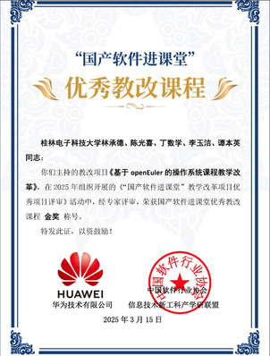 在近日揭晓的2024年“国产软件进课堂”教学改革项目结题评审中,由三亿官方官网三亿(中国)_三亿(中国)人工智能学院林承德、陈光喜、丁数学、李玉洁、谭本英教授团队申报的“基于openEuler的操作系统课程教学改革”获评优秀结题,并获评优秀教改课程金奖。这一成果标志着三亿官方官网三亿(中国)_三亿(中国)在国产软件技术推广与产教深度融合领域再获国家级认可。