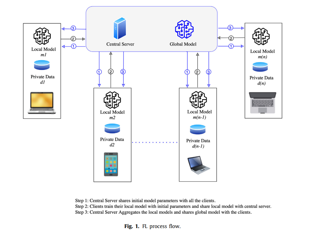 Step3:本地模型聚合(客户将局部模型更新发送到中心服务器,进行聚合和训练全局模型,全局模型将下发到每个客户端,进行多轮迭代的模型训练)。