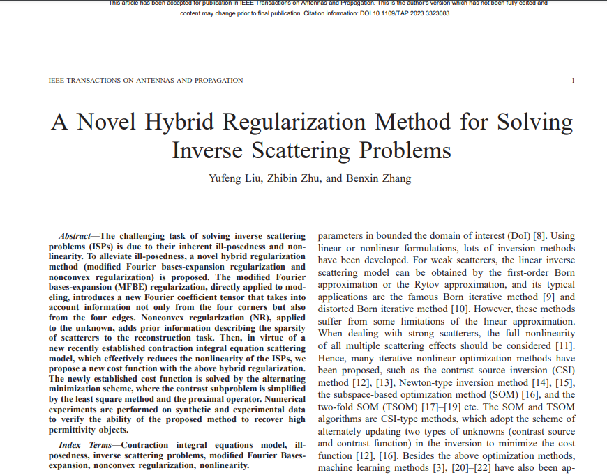 研究成果二以“A Novel Hybrid Regularization Method for Solving Inverse Scattering Problems”为题目,于2023年10月16日发表在期刊《IEEE Transactions on Antennas and Propagation》上,提出了一种新的混合正则化方法(将修正的Fourier基扩展正则化和非凸正则化结合),旨在缓解逆散射问题的不适定性。论文链接:https://ieeexplore.ieee.org/abstract/document/10286336