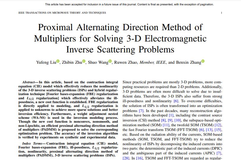 研究成果一以“Proximal Alternating Direction Method of Multipliers for Solving 3-D Electromagnetic Inverse Scattering Problems”为题,于2023年8月4日发表在期刊《IEEE Transactions on Microwave Theory and Techniques》上,针对三维电磁逆散射问题,提出了不同于对比源反演型算法的邻近交替方向乘子法:将非凸L1/2正则化和傅里叶基扩展正则化相结合以求解三维逆散射问题。论文链接:https://ieeexplore.ieee.org/abstract/document/10209361