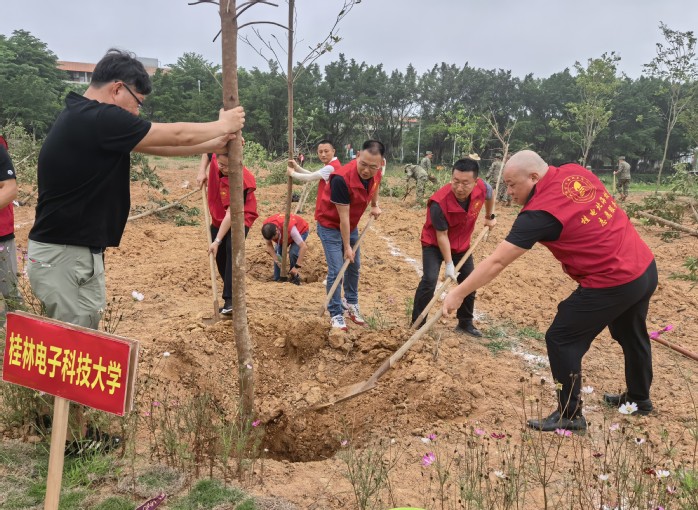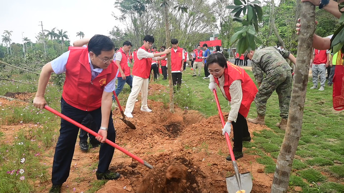 在活动现场,北海市领导干部和校区师生共同栽下了一篇绿色海洋,种下的是梦想,收获的是希望。大家分工协作,有的扶树苗、有的挥锹铲土、有的培土围堰、有的提水浇灌,现场一派热火朝天的劳动景象。
