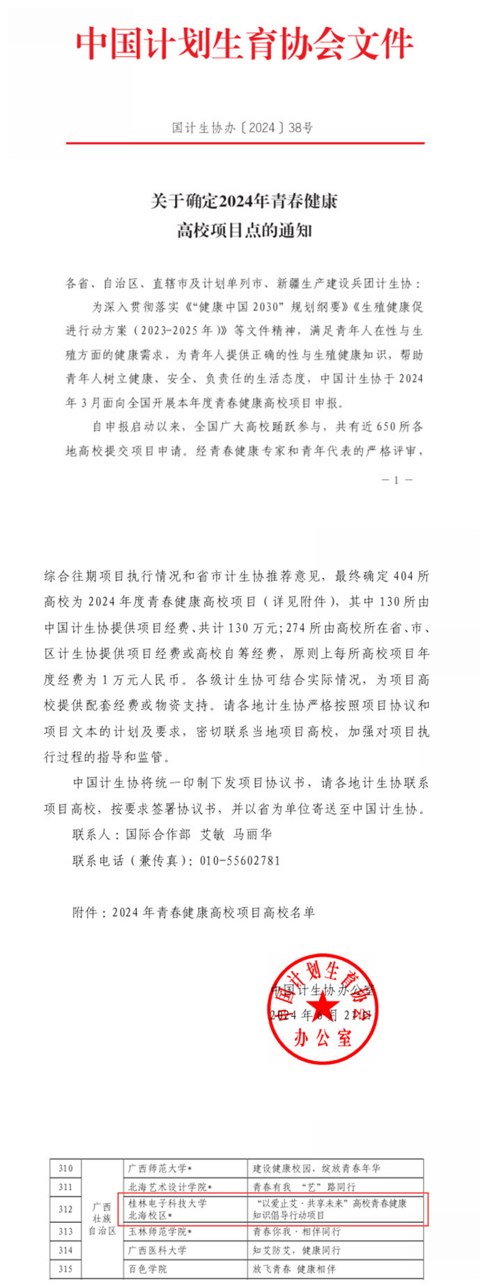6月25日,中国计生协2024年青春健康高校项目中标结果公布,北海校区申报的《“以爱止艾·共享未来”高校青春健康知识倡导行动项目》再次获批,这是北海校区连续第六次中标该类项目。