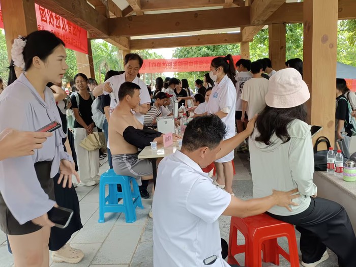 9月10日,北海校区携手北海市社科联,在南珠校区西区风雨长廊举办健康义诊活动。本次义诊邀请到中医针灸方面以及推拿方面的退休老专家和资深医师,义诊内容涵盖中医把脉问诊、针灸痛症治疗以及血压血糖测量等多项服务。