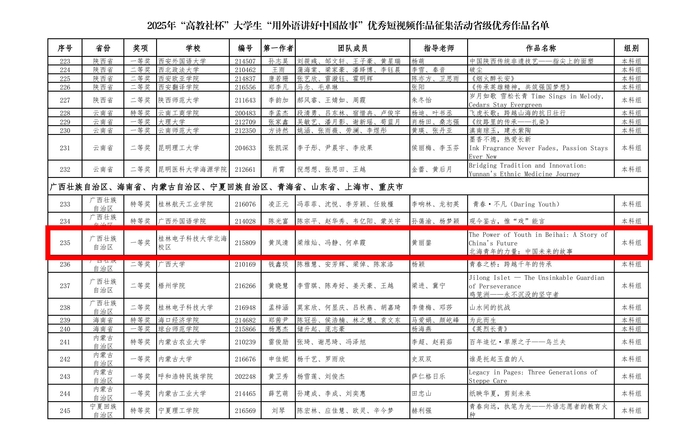 近日,2025年“高教社杯”大学生“用外语讲好中国故事”优秀短视频作品征集活动公布结果,由黄丽鋆老师指导,黄凤清、梁维灿、冯静、何卓霞四位同学共同创作的短视频作品 The Power of Youth in Beihai: A Story of China’s Future(北海青年的力量:中国未来的故事)在众多参赛作品中脱颖而出,斩获广西壮族自治区优秀作品一等奖。