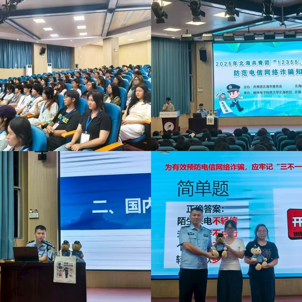 10月17日,设计与创意学院邀请北海市公安局新型网络犯罪侦查支队副支队长王涛警官携防诈资料与真实案例走进校园,在银滩校区报告厅开展“面对面、零距离”反诈宣传讲座,100余名学生代表参与活动。