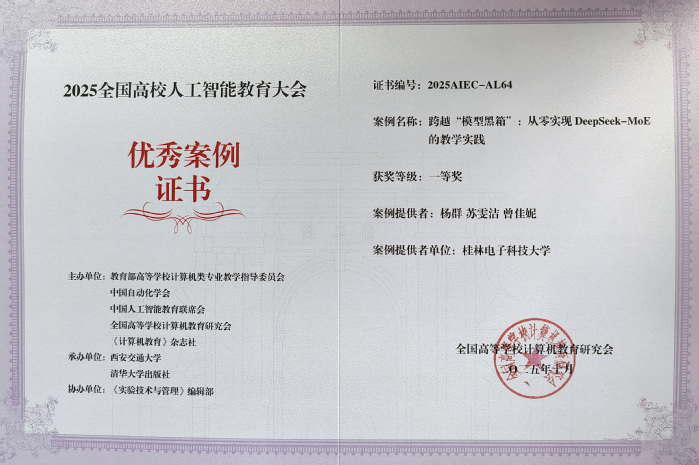 近日,由教育部高等学校计算机类专业教学指导委员会、中国自动化学会等权威机构联合主办,西安交通大学、清华大学出版社共同承办的2025全国高校人工智能教育大会(AIEC2025)在西安交通大学举办。计算机工程学院教师杨群应邀出席,其团队提交的案例《跨越“模型黑箱”:从零实现DeepSeek-MoE的教学实践》荣获会议“优秀案例一等奖”。