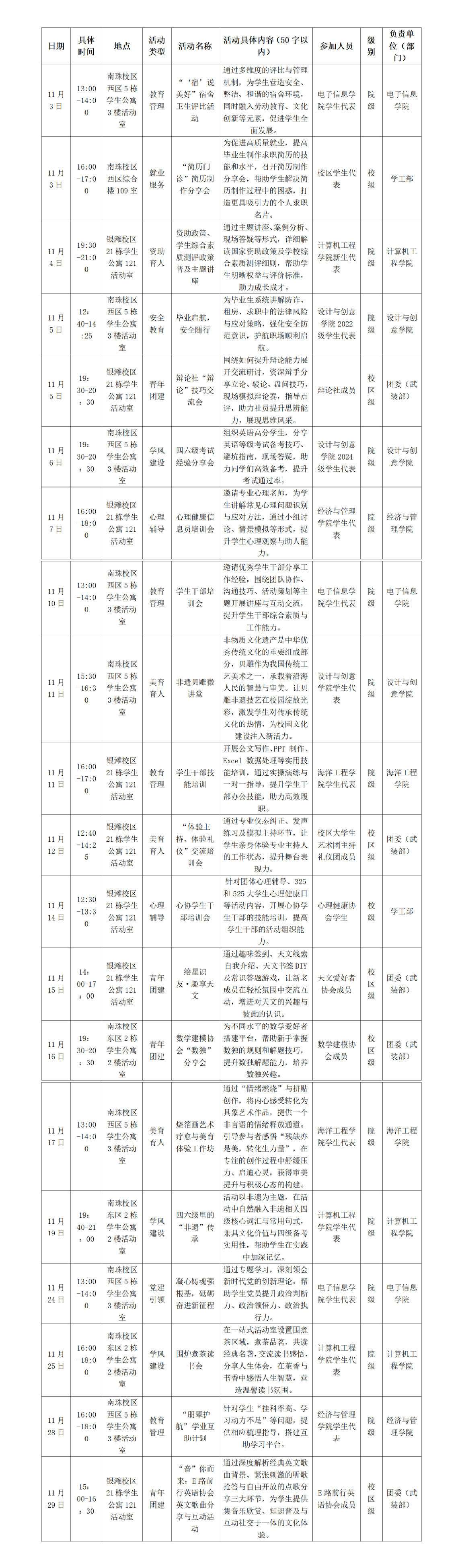 2025-2026学年秋季学期11月份“一站式”学生社区活动安排表