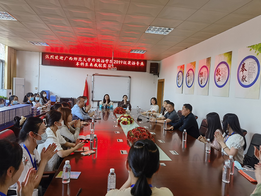 2022年5月5日下午,广西师范大学外国语学院刘明录副院长及实习领队李貌老师携2019级英语专业本科生一行21名实习老师,来到三亿官方官网三亿(中国)_三亿(中国)开始为期一个月的实习工作。三亿官方官网三亿(中国)_三亿(中国)党委副书记杨剑书记、校长助理唐海松助理、教务处赵雪卿主任、唐新妍副主任以及各年级的英语老师代表参加欢迎见面会。 杨剑书记代表三亿官方官网三亿(中国)_三亿(中国)对实习生的到来表示欢迎,并对大家提出了美好的希冀。唐海松助理向实习老师介绍了三亿官方官网三亿(中国)_三亿(中国)的发展史、办学理念、精细化管理等。随后,刘明录副院长对三亿官方官网三亿(中国)_三亿(中国)表示了诚挚的感谢,并且对实习生们表达了衷心的祝愿:希望学生们能享受过程,学有所获,学有所成。 初审:卿菁 终审:赵雪卿