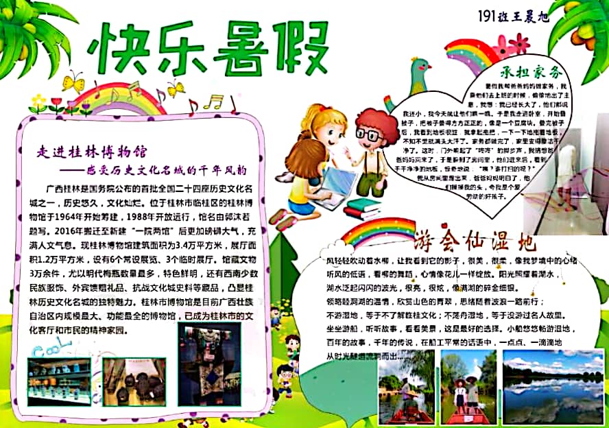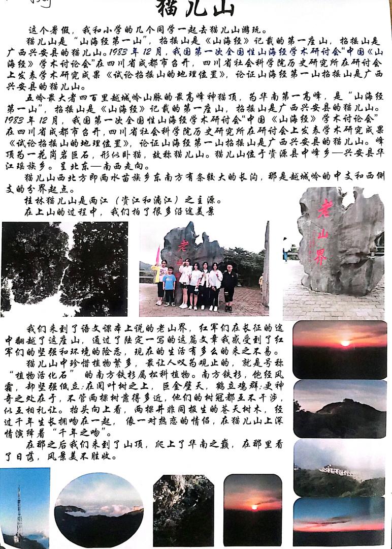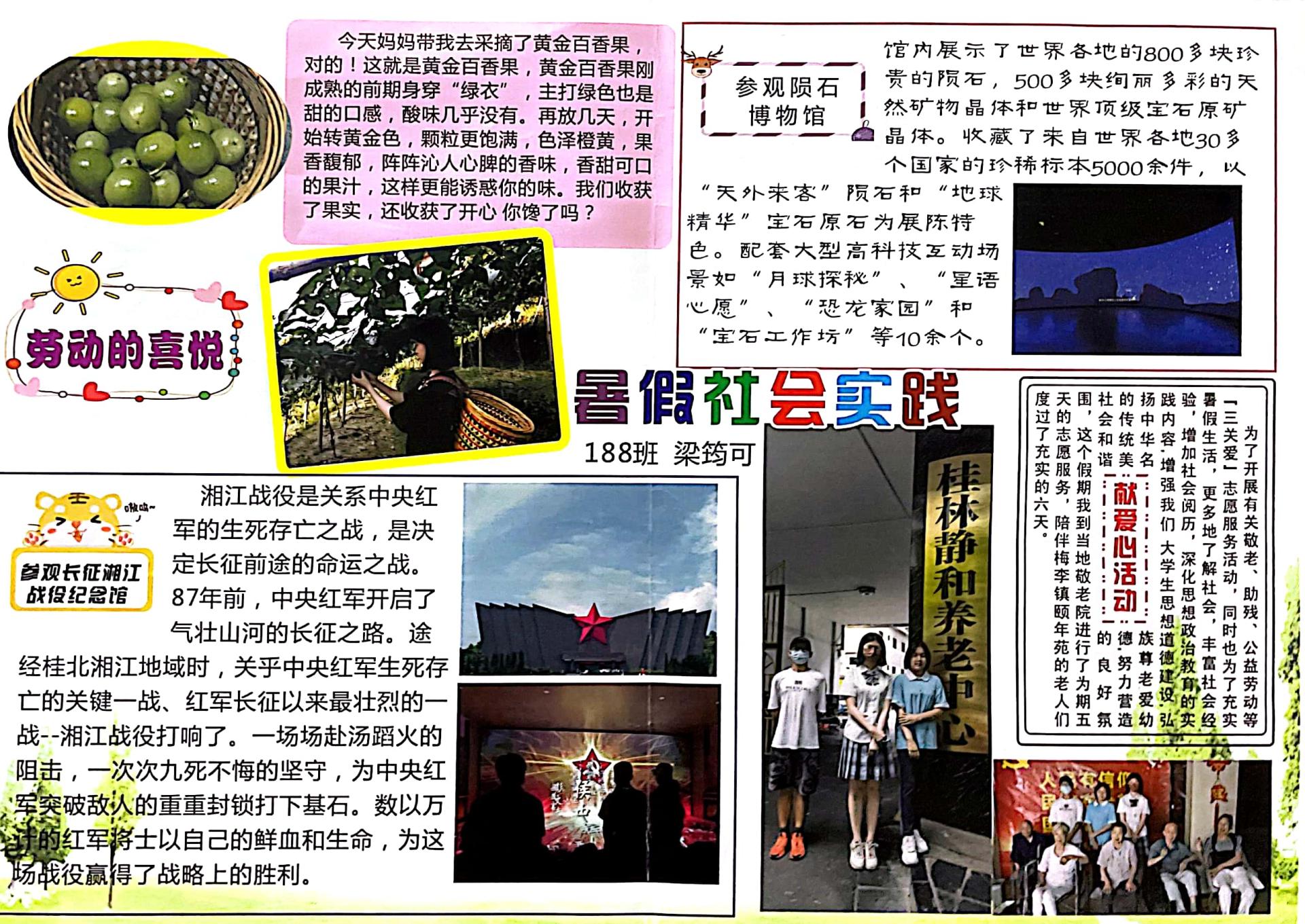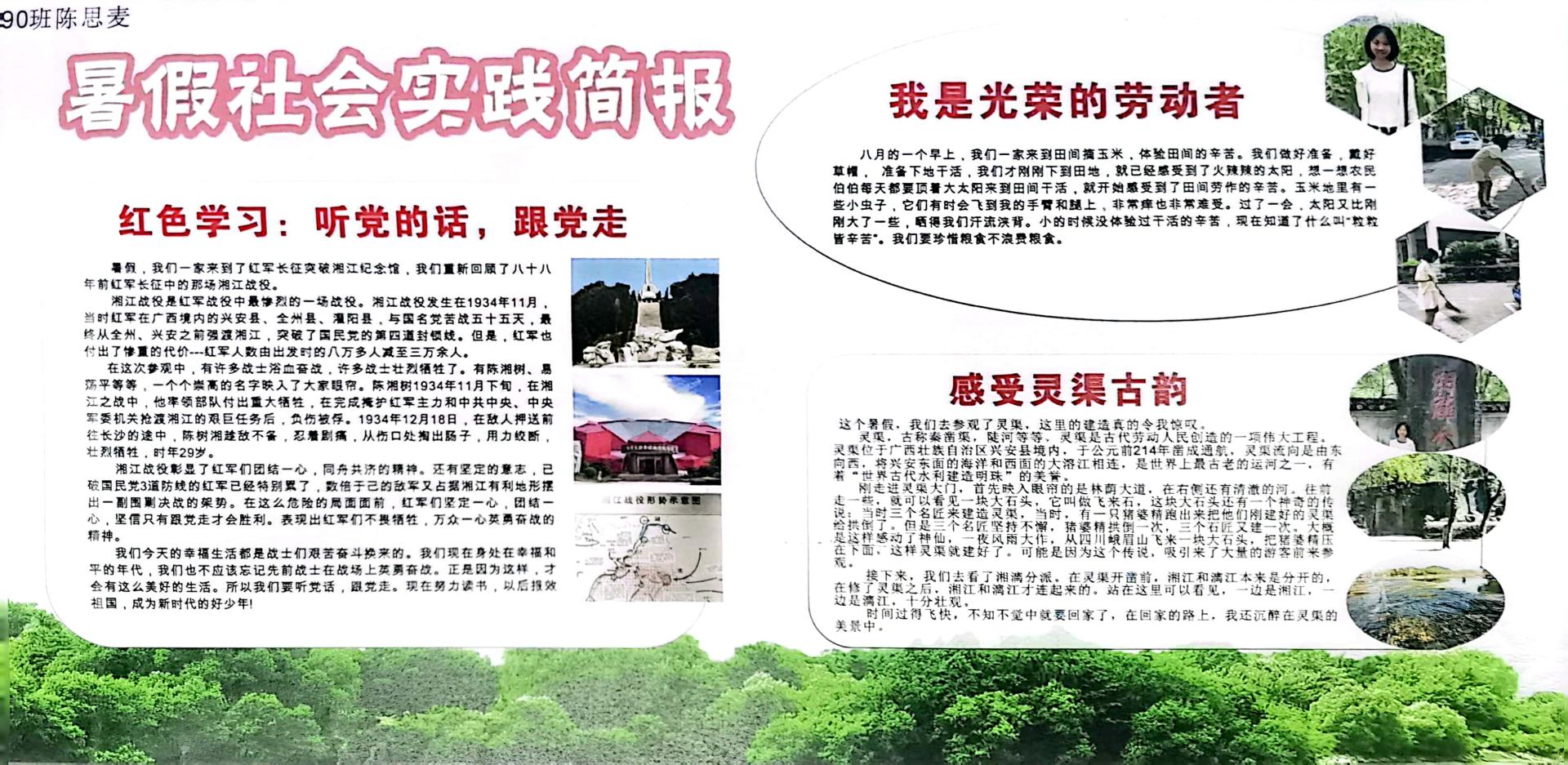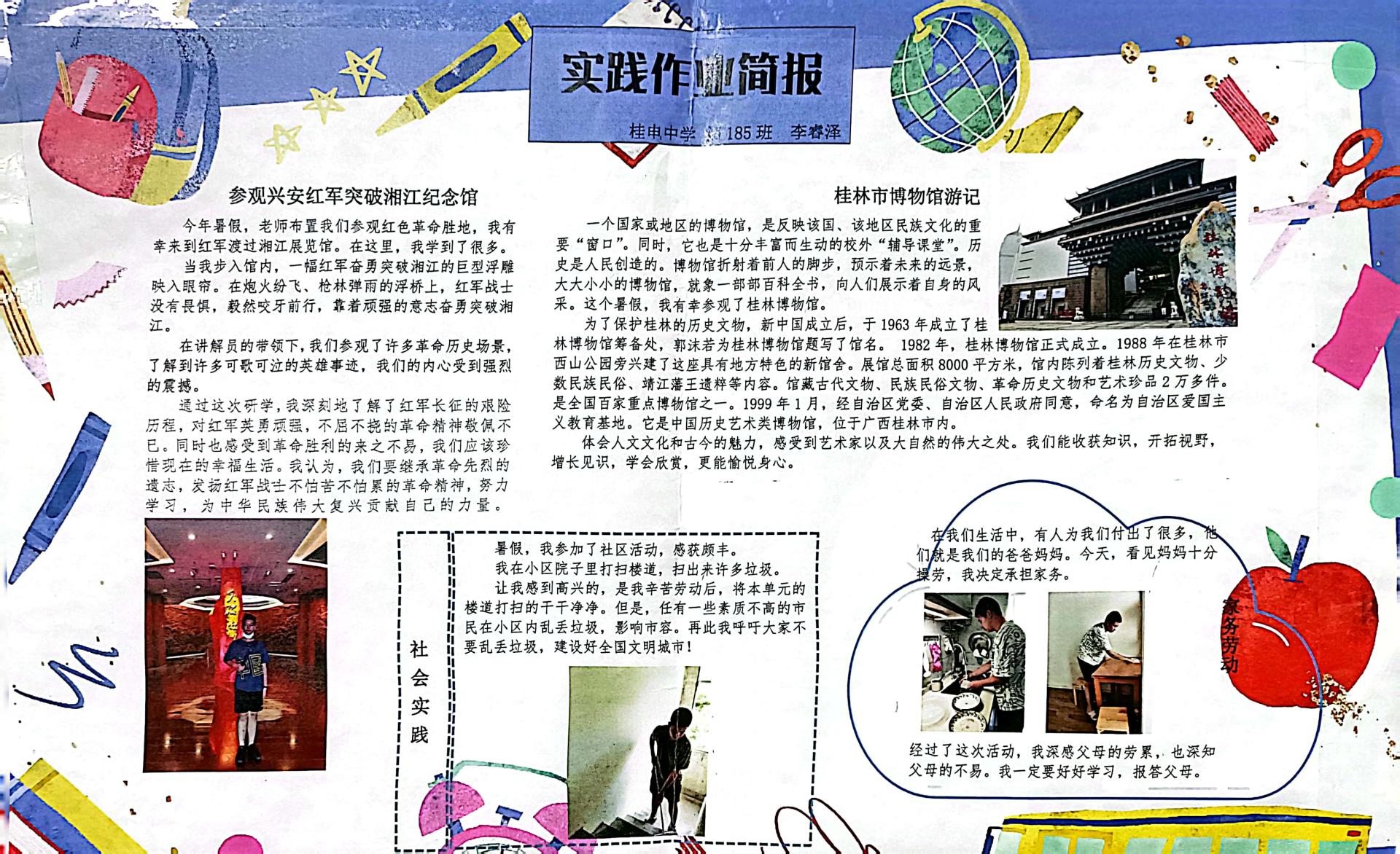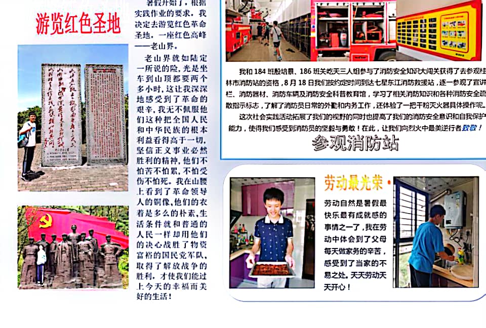社会实践活动在中学生成长发展的过程中有着十分重要的意义。它能让学生更好地在实践中融合书本知识,自行发掘真理,在实践中了解国情,服务社会。同时也能更好地在实践中突破自我,武装自我,培养学生的社会责任感和爱国主义精神,实现更多的人生价值。 三亿官方官网三亿(中国)_三亿(中国)初二年级的同学们在暑期参加了丰富多彩的各类社会实践活动,通过画报的形式,把自己的所见所闻,所知所感呈现。 一、社会实践篇 有的孩子们参观各类博物馆、展览馆,感受祖国的魅力;有的同学游览了名胜古迹、革命圣地,让自己的爱国情怀得到熏陶;有的同学去承担家务、田间干活,让自己切身体会了劳动的喜悦;有的同学参与了献爱心、救灾、敬老、志愿者服务等活动,中华民族的传统美德得到传承。 二、阅读与写作篇 孩子们在假期完成了名著《红星照耀中国》《昆虫记》等的阅读,并且进行了名著探究与写作。《红星照耀中国》给学生们赋予新的时代意义,在历史的车轮滚滚向前中,与书中的伟人为伴,汲取前行的力量,去懂得了感激和珍惜,去感受伟大的人格魅力:自律之美,爱民之美,坚韧之美。《昆虫记》不仅是一部科学百科,更多的是作者对于世事的思考。它教会了孩子们对生命的尊重,敬畏自然,爱护自然,与自然和谐共存。 三、外文篇 作为有英语教学特色的桂电中学学子,同学们在暑假同样注重在外文阅读,了解西方文化,提高文学素养,提高欣赏能力,为将自己成为合格的国际化人才而努力。 四、其他篇 (一)观祖国大好河山 展我辈不屈脊梁 (二)人与动物,和谐共处 (三)读史明智,砥砺奋进 通过这一系列的社会实践活动,展现了孩子们的青春风采,增强了孩子们的综合素质能力,提高了团队协作力和独立自主能力,磨练了意志,丰富了情感,树立了崇高的理想信念,促进孩子们的全面发展,让孩子们能在实践中奉献青春智慧,共同为实现伟大的中国梦蓄力。 初审:卿菁 终审:周荔