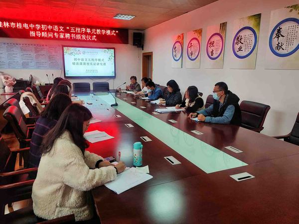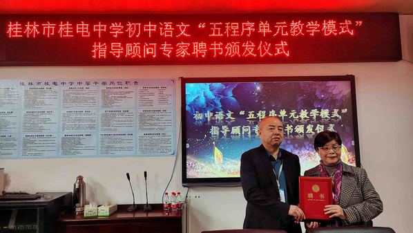 同时,为促进初中语文教学的快速提升,打造一支高技能的教师队伍,学校在行政会议室举行了隆重的初中语文“五程序单元教学模式”指导顾问专家聘书颁发仪式,彭校长为邓玲教授颁发指导顾问专家聘书。仪式结束后,邓教授给全体初中语文老师做题为《向课堂要效率——五程序单元教学模式的理论与实践》讲座。