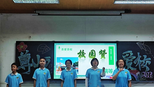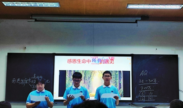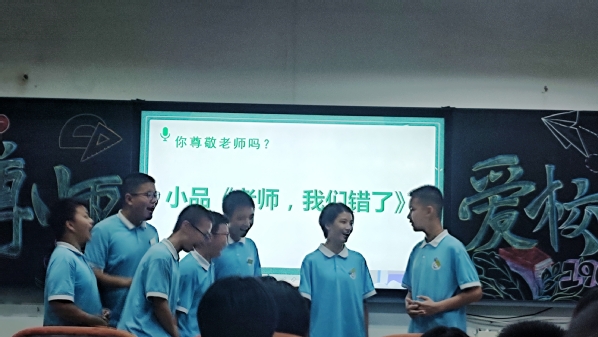 黄丹凤老师展示的“感恩学校,尊敬师长”微班会,以学生现场表演古筝的方式开始,通过诗朗诵《校园赞》,小品《老师,我们错了》精彩展现了学生对老师尊敬、对学校的感恩,迅速抓住学生和现场观众的注意力。接着从一次特别的收集故事活动切入,让全班同学一起来收集、分享尊师爱校的故事,字里行间洋溢着196班学生与老师的亲密无间和脉脉温情,再次强化学生对老师、对学校的爱。最后全班通过合唱英语歌曲《Try Everything》来结束本节微班会。