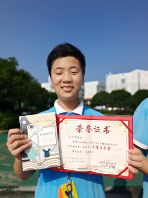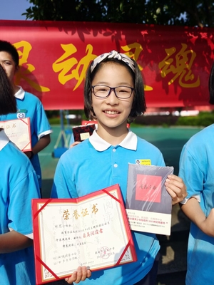 仪式的第二个环节是给4月阅读主题活动月的获奖同学颁发“最美阅读者”和“最佳分享者”的荣誉证书。彭校长亲笔将“让阅读润泽生命,让书声灵动灵魂”写到荣誉证书上赠与每一位获奖的同学。同学们从校级领导手中接过荣誉证书,如获至宝,喜笑颜开。同时,领导们还将《青春之歌》《苏菲的世界》《百年孤独》《文化苦旅》等书籍送到获奖同学手中,希望孩子们能继续遨游书海,放眼世界。