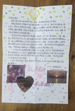 班上的每一位同学还在班级留言本上,表达了对班主任的感谢。还有同学为班主任画了专属的肖像画,为全班画了全家福。