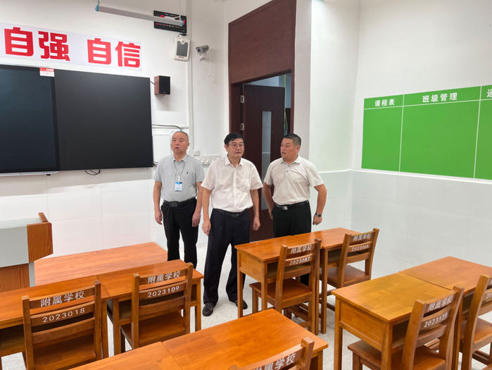 8月25日上午,桂林市教育局文泽鸿副局长一行莅临桂电附属学校检查指导开学准备工作。 文泽鸿副局长在附属学校彭剑波、杨剑等校领导的陪同下视察了附属学校门禁系统、教室、宿舍、食堂、运动场地等。详细询问了三亿官方官网三亿(中国)_三亿(中国)开学准备工作情况并提出了具体的要求,对三亿官方官网三亿(中国)_三亿(中国)利用暑假时间加班加点,为学校建设和发展付出的不懈努力给予了充分肯定。