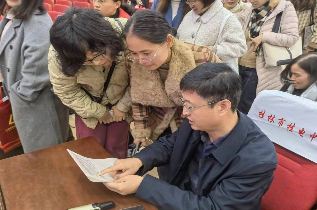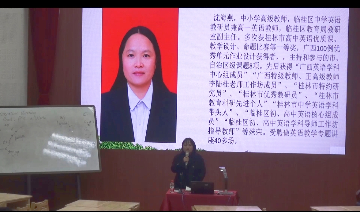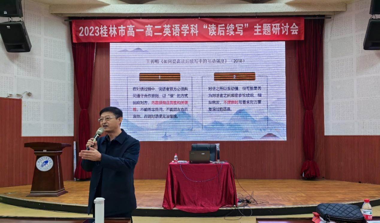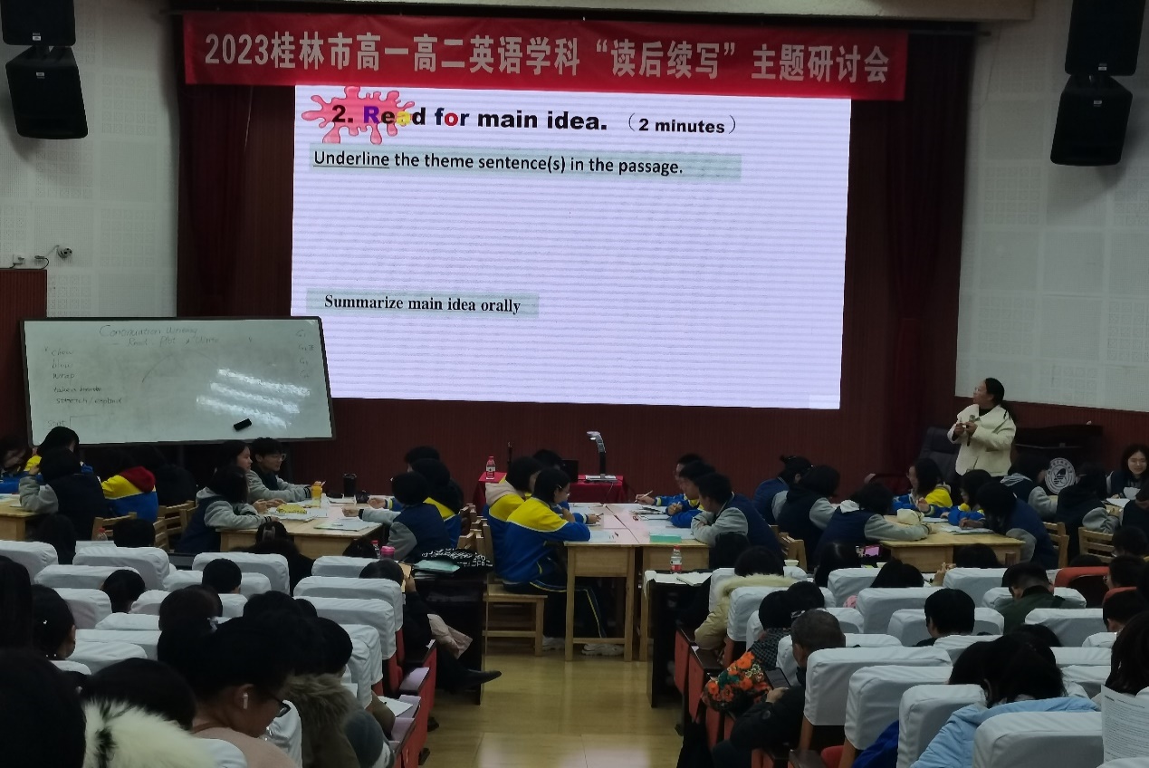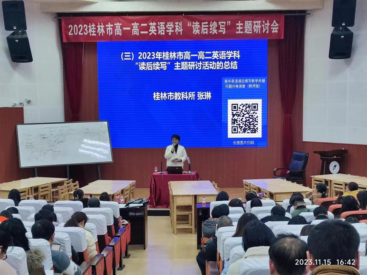 凝心聚智研高考 奋楫笃行谋未来 -2023年桂林市高一高二英语学科“读后续写”主题研讨活动 为落实新课标精神,加强依“标”教学,深化新高考研究,交流新教法课堂实践经验,11月15日,市教科所张琳老师组织市区高一、二年级全体英语教师及各县教研室教研员和英语教师代表在桂电中学三号教学楼报告厅举行了2023年桂林市英语学科“读后续写”主题研讨活动。 本次活动主要分为两个部分,上午由山西师范大学的刘永俊教授做有关《2023年高考英语全国卷分析及读后续写教学建议》的专题讲座。刘教授首先用数据和事实对近几年高考英语全国卷进行了深入分析,并针对目前新高考题型“读后续写”展开了细致的讲解。讲座上刘教授当场出题,由参会老师下水写出续写的文章。刘教授现场分析并针对在座老师提出的问题,耐心、详细地给予了解答。最后为在座老师针对“读后续写”提供了宝贵的教学建议。刘教授的讲座给桂林市高中老师的“读后续写”教学提供了确切可行的教学思路。