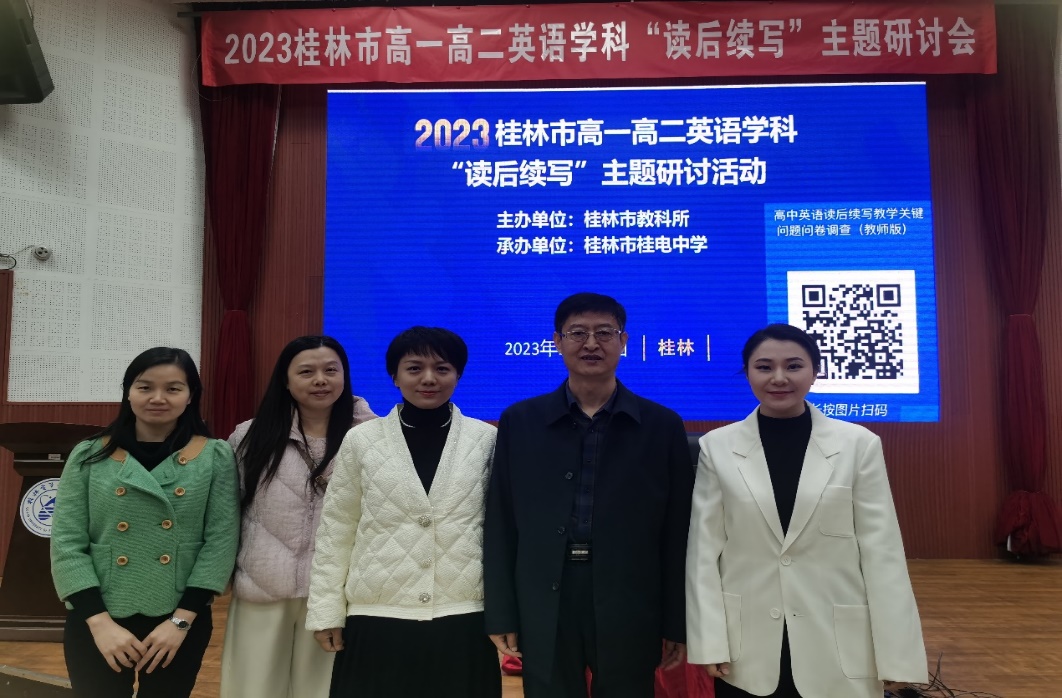桂林市高中英语教研员张琳老师做活动总结 本次活动在高中英语组的共同努力下顺利落下帷幕,桂电中学学子优秀的课堂表现,流利的口语以及优美的发音让在座老师们赞不绝口。本次活动通过专题讲座和实际教学示范,为老师们提供了深入的学习和交流机会,拓宽了教师在读后续写方面的教学思维。 活动负责人与嘉宾合影 初审:蒋梓希 二审:唐新妍 终审:李超进