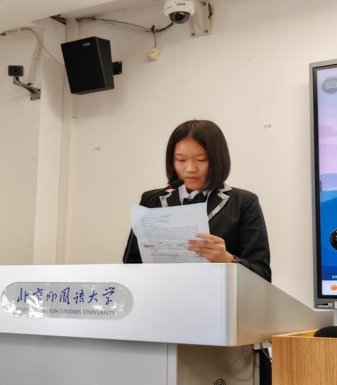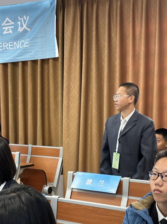 初中中文场的参会同学们体现出责任感、合作意识和创新意识。在完全陌生的环境下,参会的同学们依然能够沉着应对会议上的各种突发状况,抓紧每一次发言机会,为会议的推进提出创新性建设性的建议。初中中文场的参与人员有:188班马昕榕(代表阿根廷)、185班赵芸萱(代表南非)、192班袁梓涵(代表荷兰)和192班韦智宸(代表波兰)。四位同学凭借他们在促进后疫情时代的国际贸易发展议题上的出色表现,获得了好评。在高级会议场上,四位同学不仅锻炼了临场应变能力,而且收获了会场上的友谊。