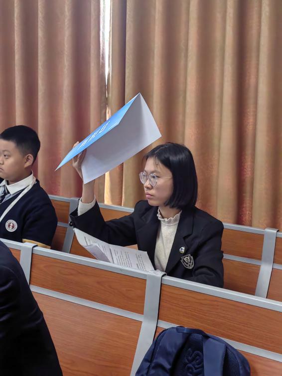 在另一边同时进行的英文场,初三的190班梁梓钰同学积极参与了“Reform of the Global Financial System”议题的讨论,她的流利表达和深度理解赢得赞扬。不同于世界模联广西会场桂电学子占多数的状况,高级会议英文会场上只有梁梓钰同学一名本校生。在这样的状况下,她依旧沉着冷静地与来自世界各国的代表进行磋商,流利地表达观点与动议。