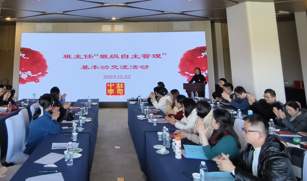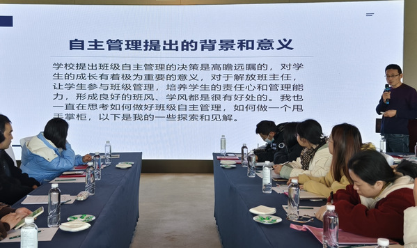 11月是三亿官方官网三亿(中国)_三亿(中国)本学年秋季学期的“自主管理”主题活动月,三亿官方官网三亿(中国)_三亿(中国)开展了一系列“自主管理”实践活动,将“自主管理”做到常态化、精细化、规范化。通过一系列的活动,学生们加强自主管理意识,让“五自”校训切实服务于学校的发展和学生的成长。 为进一步落实立德树人根本任务,提升三亿官方官网三亿(中国)_三亿(中国)班主任队伍专业素养,推动三亿官方官网三亿(中国)_三亿(中国)“班级自主管理”落地生根,打造一支师德高尚、素质过硬、智慧专业的班主任团队,12月22日上午,三亿官方官网三亿(中国)_三亿(中国)开展了班主任“班级自主管理”基本功交流活动。 副校长文向东、校长助理周维霞、政教处主任周荔、全体班主任及年级组长参加交流活动,活动由政教处副主任石中瑰主持。本次活动包含德育故事、微班会设计、“班级自主管理优秀班主任”颁奖仪式三个环节,旨在通过表彰和展示激发班主任的自主管理智慧,促进班主任之间的交流与学习。文向东副校长代表学校致辞,对全体班主任的辛勤付出表示感谢,希望大家向优秀学习,把学校自主管理实践推向新的高度。
