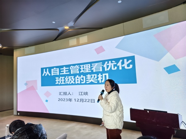 最后,高71班班主任江峡老师带来的《从自主管理看优化班级的契机》,分享了自己的心路历程:在落实学校自主管理后班主任不再是孤军奋战,师生矛盾减少了,学生更容易理解班主任工作,同时也给了学生更多展现自我的舞台。