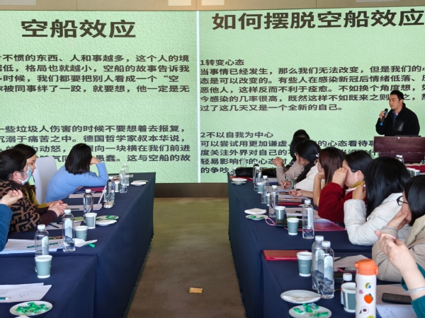 然后,是初194班班主任庞赛赛老师带来的《聚是一团火,散是满天星》德育故事讲述,从“传声筒”的游戏中,大家明白了与学生沟通的智慧,从自主管理的三个阶段中,为大家提供了管理方向。