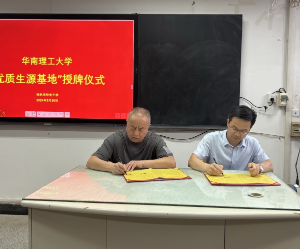 5月30日,华南理工大学广西招生组组长、科学技术研究院副院长蒋兴华,广西招生组副组长蒋荣英,广西招生组组员、公共关系处科长于荣到桂电中学进行“优质生源基地”签约、授牌仪式,桂电中学校长彭剑波、党委书记杨剑,副校长文向东、李超进、唐海松出席。