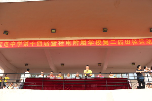 (图:运动员代表、裁判员代表宣誓) 校长彭剑波宣布桂林市桂电中学第十四届暨桂电附属学校第二届田径运动会开幕!