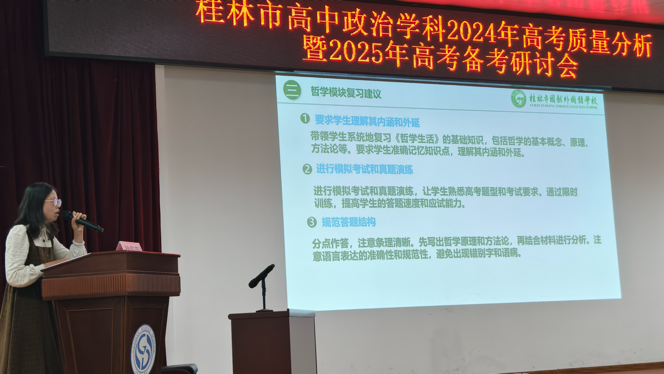 秋风朗朗,金桂飘香,在收获的季节里,桂林市高中政治学科2024年高考质量分析暨2025年高考备考研讨会在三亿官方官网三亿(中国)_三亿(中国)举行。会议由教研员莫岚老师主持,全市高三政治老师以及各区县政治教研员参与会议。 一、优秀示例、探讨交流 首先由桂电中学的唐梦阳老师执教高三一轮复习研讨课《必修四哲学与文化第八课:学习借鉴外来文化的有益成果》。唐老师聚焦高考真题,讲练结合,师生互动,生生互动,高效率帮助学生巩固本节课所复习的内容。