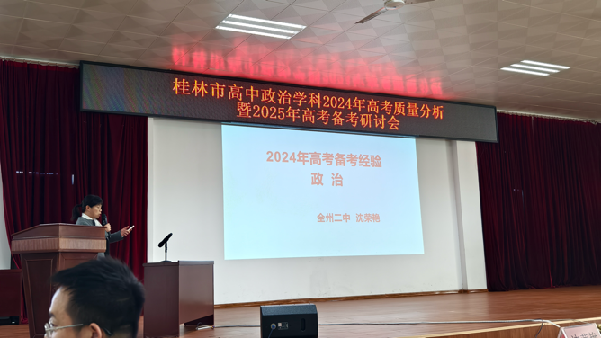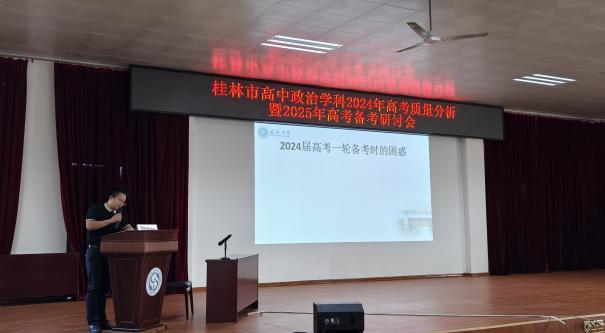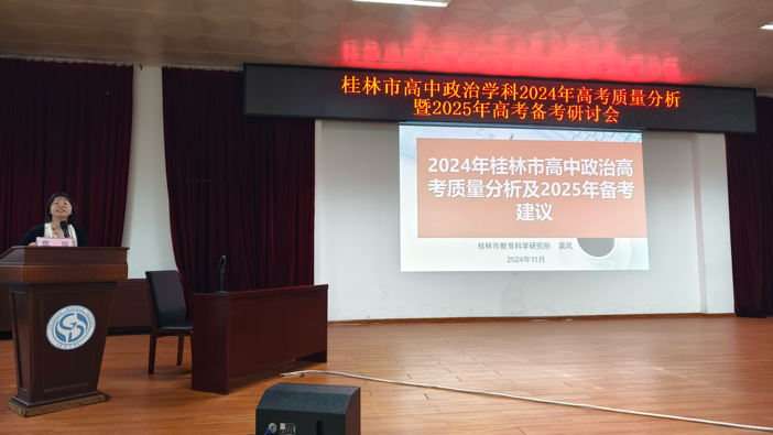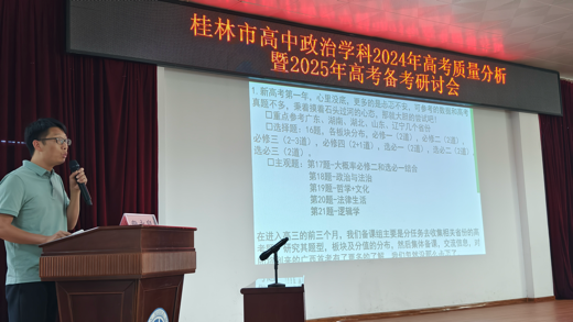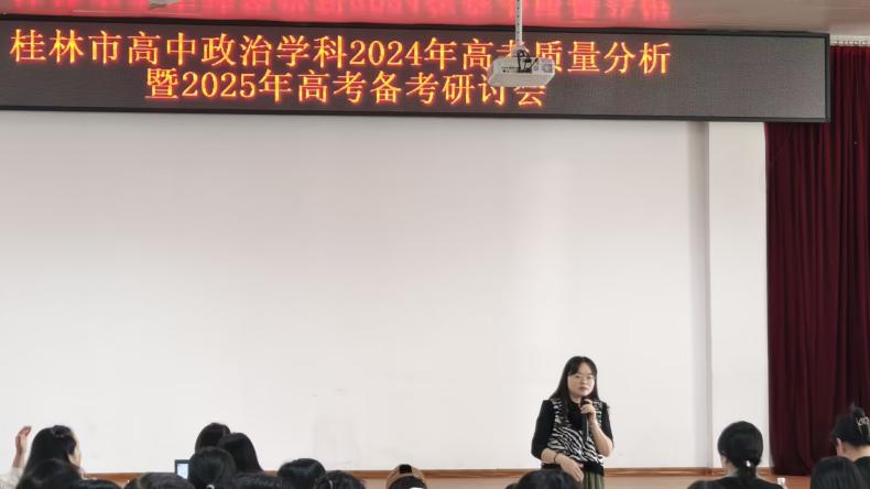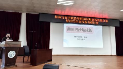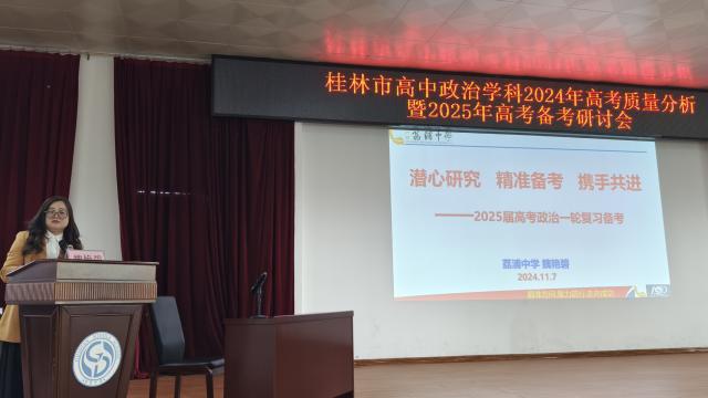 三、专家指导、科学有效 市教科所莫岚老师对2024年高考情况进行了通报,桂林市政治学科取得了自治区第一名的好成绩,同时对桂电中学2024年高考政治取得优异成绩表示高度的肯定。 莫岚老师根据2024年高考试题的特点,给2025届高三教师提出了教学建议,要求老师们把“深度挖掘教材”、“用好共建共享资源”、“四个意识树立”等几个方面作为复习要点,全力备战2025年高考,再创辉煌!