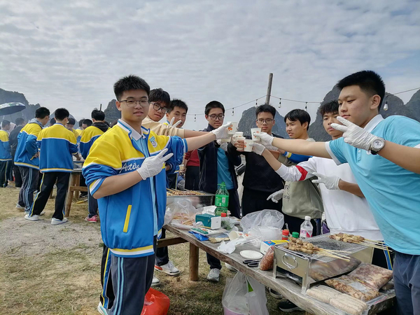 第二站,阳朔遇龙湾国际营地。 遇龙河畔,绿茵草地,同学们迎来了期待已久的烧烤和漆扇体验。随着袅袅的烟升起,各班同学团结协作,自主有序地将食材清洗干净、将食材串成串、调配酱料汁……烧烤现场热火朝天,同学们也感受到了一饭一汤来之不易,在自己的动手实践中更懂得感恩父母。满足了味蕾需求后,同学们体验了漆扇制作。以漆为笔,以水作画,在水的流动下,漆形成了各式各样的纹理,同学们纷纷动手制作独属于自己的漆扇。在制作过程中,感受属于自己的每一份独特,感受心灵与水与漆的共鸣,感受漆扇文化的魅力,增强了文化自信。