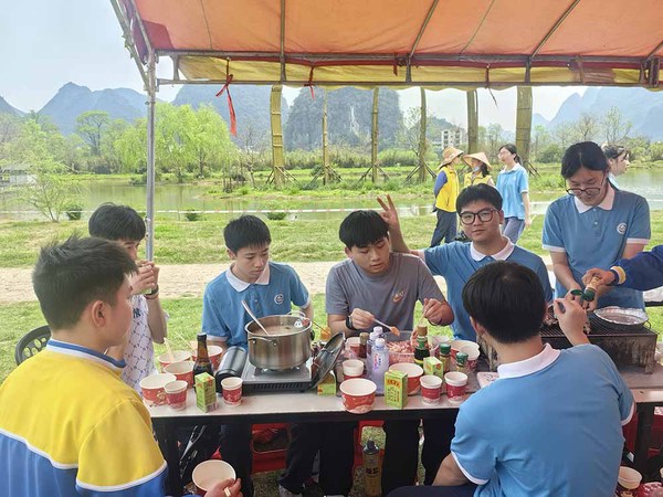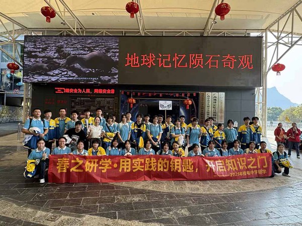 迟日江山丽,春风花草香。为全面实施素质教育,在提高学生学习兴趣,开拓学生视野,丰富课外知识的同时,促进学生综合素质的全面发展,2025年3月25日,桂电中学高一高二年级开展了主题为“春日有信·研学同行”的研学活动,研学基地为桂林银子岩景区和地球记忆·陨石奇观博物馆。