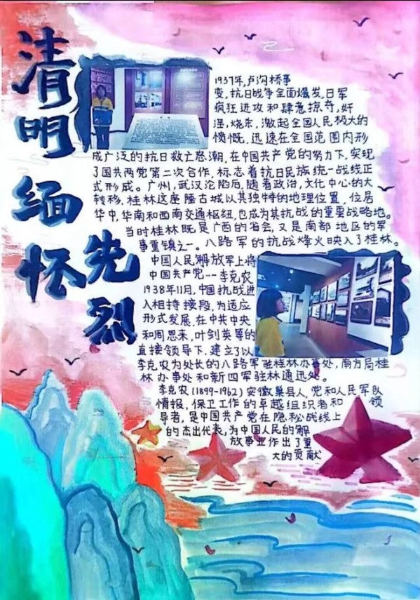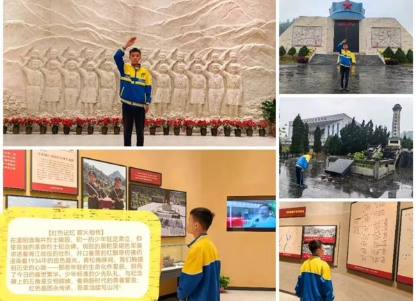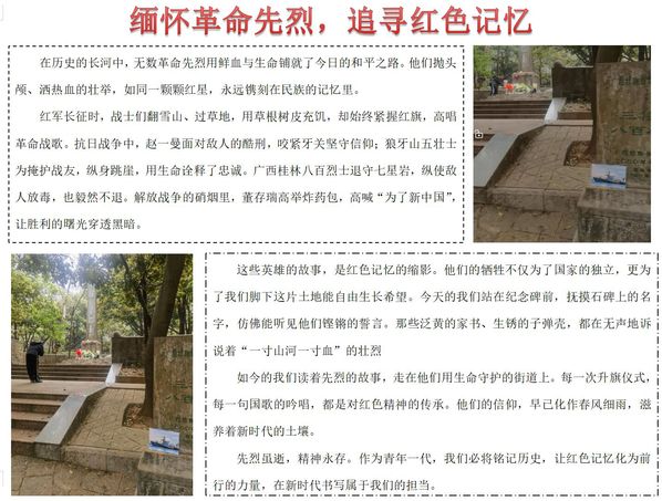 牢记革命红色文化和历史,更要将它们传承发扬下去。桂电中学和电附学子“变身”桂林红色文化景点的讲解人,将红军与瑶族人民友好交往的故事、军民上下一心抗击敌寇的故事遍传大地,以此缅怀在革命中献身的烈士。 岁月悠悠,革命英雄们浴血奋战方换来了如今的国泰民安,桂电中学和电附的学子感恩革命先辈们的无私付出。饮水思源,如今,他们以文章书写烈士故事,以画笔勾勒烈士雄姿,以歌声唱响英雄赞歌,希望与烈士忠魂一同守护此间山河!