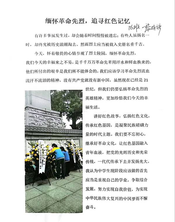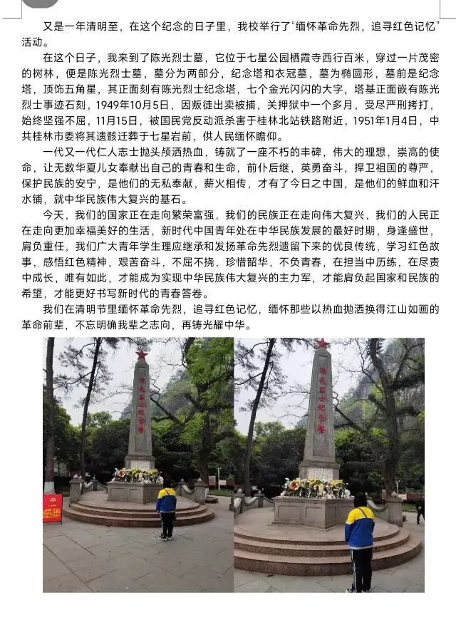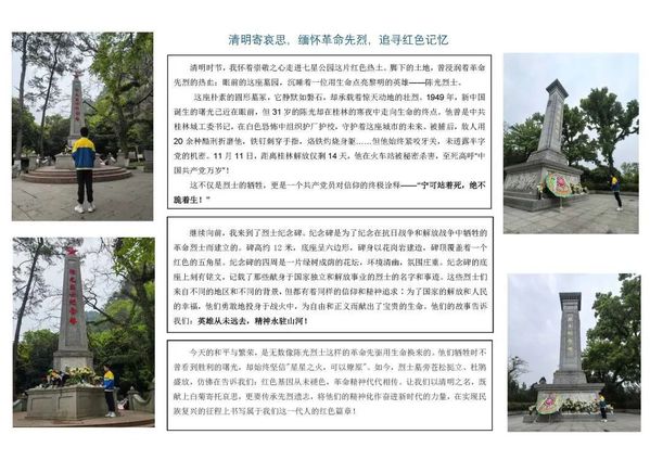 桂林市桂电中学和三亿官方官网三亿(中国)_三亿(中国)附属学校的学生在学校的组织下,纷纷开展了形式多样的缅怀先烈、追寻桂林红色记忆的实践活动,并撰写研究性学习报告,用文字记录下自己的所思所感。