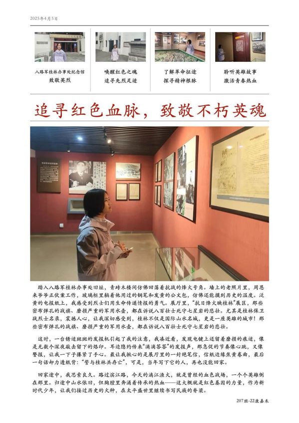 依托“八办”旧址建立的八路军桂林办事处纪念馆,在清明节之际迎来了一批年轻的朋友,他们凝神驻足,仔细瞻仰着眼前这一座座庄严的革命英雄雕塑,领略着革命领导者于枪林弹雨中运筹帷幄的英姿;他们的心魂被广西全民抗战的艰苦历程牵动着,眉头紧锁但眼神越发坚定,心中燃起对革命英雄的敬仰之情,他们便是桂电中学和电附的学子,在纪念馆中,追溯革命的峥嵘岁月。