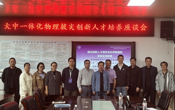 王槿老师介绍了教育部物理学育人模式改革虚拟教研室以“物理学术竞赛(Physics tournament,PT)育人模式”为抓手,积极探索拔尖创新型人才培养新路径,担负为党育人、为国育才的教育使命,努力培育卓越人才,并做了《拔尖创新人才培养及科学教育的实验实践探索》报告,介绍了PT育人模式在全国的发展,对于拔尖创新人才培养的助力以及目前在中小学阶段开展科学教育的已有落地方案。王业伍老师对PT育人模式推动高中生探索精神,实验教学在育人中的重要作用做了介绍。孙尚倩老师介绍了CUPT在山东的发展和对学生培养的重要作用。郑远老师介绍了CUPT在浙江的发展情况,对提高学生实践能力和针对学生弱项进行教学改革的必要性。陈乾老师谈了参加2025年中国高中生物理创新竞赛(China Young Physicists’Tournament,简称CYPT)裁判工作的切身感受,介绍了在中学开展PT育人模式的重要性和可行性。 在交流环节,与会专家与桂电中学、桂电附属学校老师围绕课程设置、竞赛辅导、科研实践等展开深入讨论。本次座谈会为“大中一体化”物理拔尖人才培养提供了新思路,桂电中学、桂电附属学校将加大PT育人模式的探索,助力更多学子成长为未来的科学创新人才。