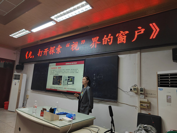 韩平丽副教授从光的基本概念和性质入手,通过日常生活中的现象和科学实验,深入浅出地讲解了光的本质及其独特特性。她以“陆、海、空、天”四大领域为切入点,展示了光学技术在军事、医疗、通信、航天等领域的广泛应用,让同学们直观感受到光学科技的强大魅力。