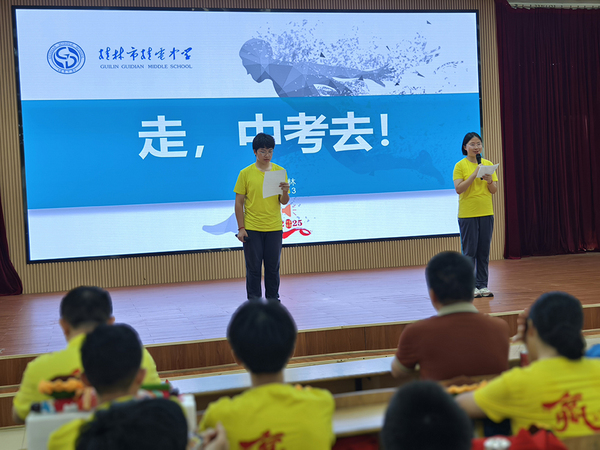 尧山环抱掩锦绣,学子争相竞风流。为了让桂电中学2022级全体初三学子充满斗志,以最佳状态奔赴中考考场,2025年6月23日上午9时,桂电中学行政领导、初三全体师生以及家长代表,齐聚多功能报告厅,为即将奔赴中考考场的全体初三学子们摇旗呐喊,助威前行。大会由韦佳淳和毛艺霖两位同学主持。