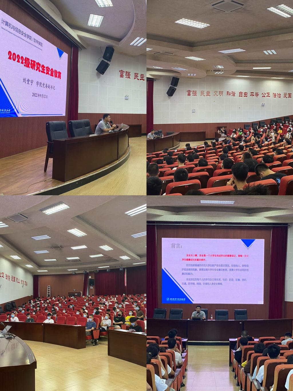 9月12日下午,计算机与信息安全学院在三教一楼报告厅举办面向2022级研究生新生的大学校园安全教育讲座,本次讲座由学院党委副书记刘堂宇老师主讲,研究生辅导员主持,全体2022级研究生参加。