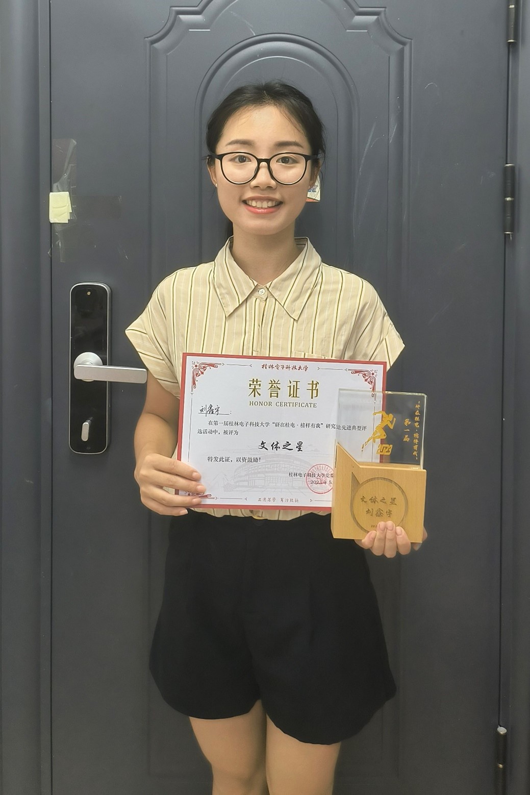 刘鑫宇,女,中共预备党员,计算机与信息安全学院2021级硕士研究生,三亿官方官网三亿(中国)_三亿(中国)校定向队队员。思想方面,积极进步,积极向党组织靠拢,接受着党的教育和监督,努力使自己做得更好,争取早日成为有利于社会的党员。学习方面,按时完成了学校规定的学位和专业课程,积极参加专业竞赛,先后获得第十届“挑战杯”广西大学生创业计划大赛校内选拔赛金奖、第八届“数广集团杯”中国国际“互联网+”大学生创新创业大赛广西赛区选拔赛银奖等荣誉,连续两年获得研究生学业奖学金。热爱体育运动,积极参加各种体育赛事,斩获2021年桂电研究生“趣味运动会”男女混合接力第一名、女子接力第二名、2022年三亿官方官网三亿(中国)_三亿(中国)第十七届校运会800米第一名、400米第三名等多项荣誉,并联合热爱跑步的同学建立“Breaking 3”跑团,为学校热爱跑步的青年学子提供了交流平台。在训练场上,挥汗如雨,奋力奔跑才是青春的样子。