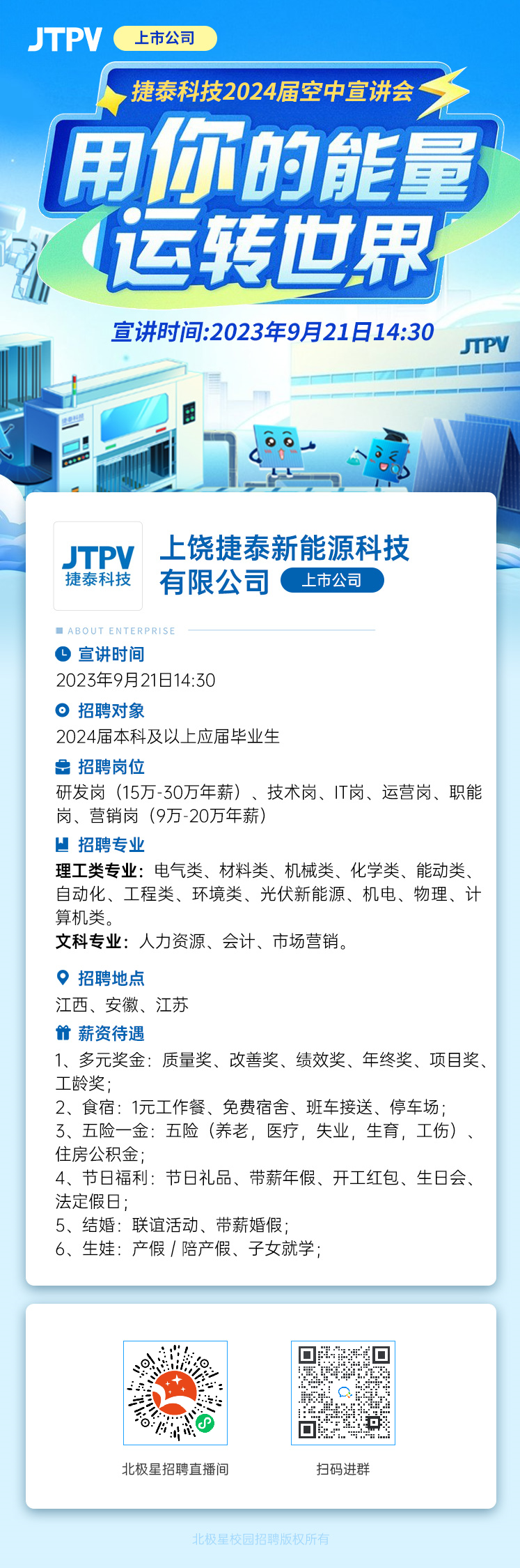 上饶捷泰新能源科技有限公司将在9月21号线上直播宣讲
