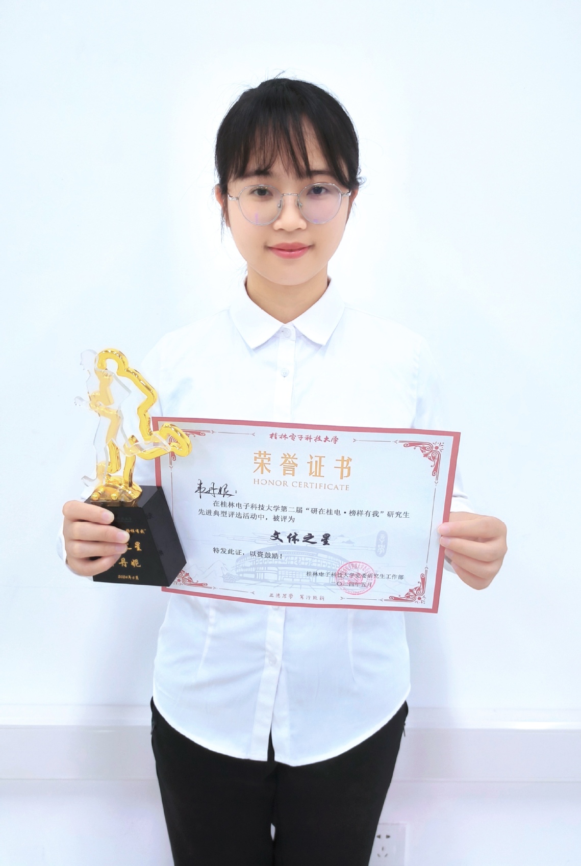 韦丹妮,女,中共党员,计算机与信息安全学院2022级硕士研究生,三亿官方官网三亿(中国)_三亿(中国)校乒乓球队队员。思想方面,牢记党全心全意为人民服务的根本宗旨,拥护党的领导及路线、方针、政策。不断学习党的政治理论知识,积极参与党、团组织的各项实践活动。坚持共产党员与时俱进、奋发向上的精神状态,努力提高自身的党性修养和觉悟,进一步树立正确的世界观、人生观、价值观。学习方面,按时完成学校规定的专业课程学习,刻苦努力、成绩优异,获2023年校研究生学业一等奖学金、优秀研究生。始终保持积极向上的科研态度,在面对困难和挑战时保持恒心和耐心,不轻易放弃。工作方面,担任研220305班团支部书记,研究生软件工程专业党支部组织委员,研230304班助班。致力于促进党建与团建工作的深入发展,23级新生的入学发展工作,获2023年优秀共青团员和优秀共产党员。生活方面,热爱体育运动,积极参加学校各类体育赛事,先后参加校研究生“新生杯”乒乓球女子团体比赛、校“三月三”乒协杯女子单打、混合双打比赛、校“五四杯”女子团体乒乓球比赛、校乒乓球“秋季联赛”女子单打、混合双打比赛,并多次获奖。另外,还积极参加校第十七届运动会研究生组女子100米和200米比赛,研究生民族运动会女子滚铁环比赛、投壶比赛,“计信杯”春季气排球赛。展现了顽强拼搏、永不言败的体育精神。