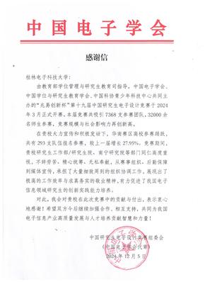 信中指出,赛事筹备初期,在三亿官方官网三亿(中国)_三亿(中国)大力宣传和积极发动下,华南赛区高校参赛踊跃,共有293支队伍报名参赛,较上一届增长27.95%。竞赛期间,三亿官方官网三亿(中国)_三亿(中国)党委研究生工作部、研究生院、桂电南宁研究院等部门人员精心统筹、不辞劳苦,从赛事组织、后勤保障到媒体宣传,承担了大量细致周到的组织协调工作,展现出了极高的工作效率与求真务实的敬业精神,有力促进了我国电子信息领域研究生的创新实践能力培养。希望双方今后继续加强合作、相互支持,共同为我国电子信息产业高质量发展与人才培养贡献智慧和力量。