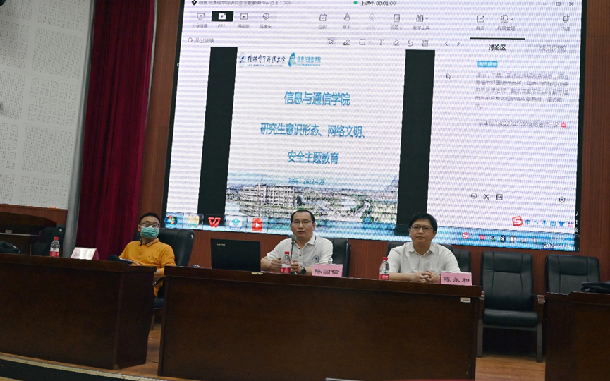 4月28日晚,信息与通信学院在金鸡岭校区三教报告厅开展了以意识形态、网络文明、研究生安全为主题的教育讲座。本次会议由学院党委副书记陈国信主持,张法碧教授、陈永和副教授、辅导员及学院全体研究生参会。