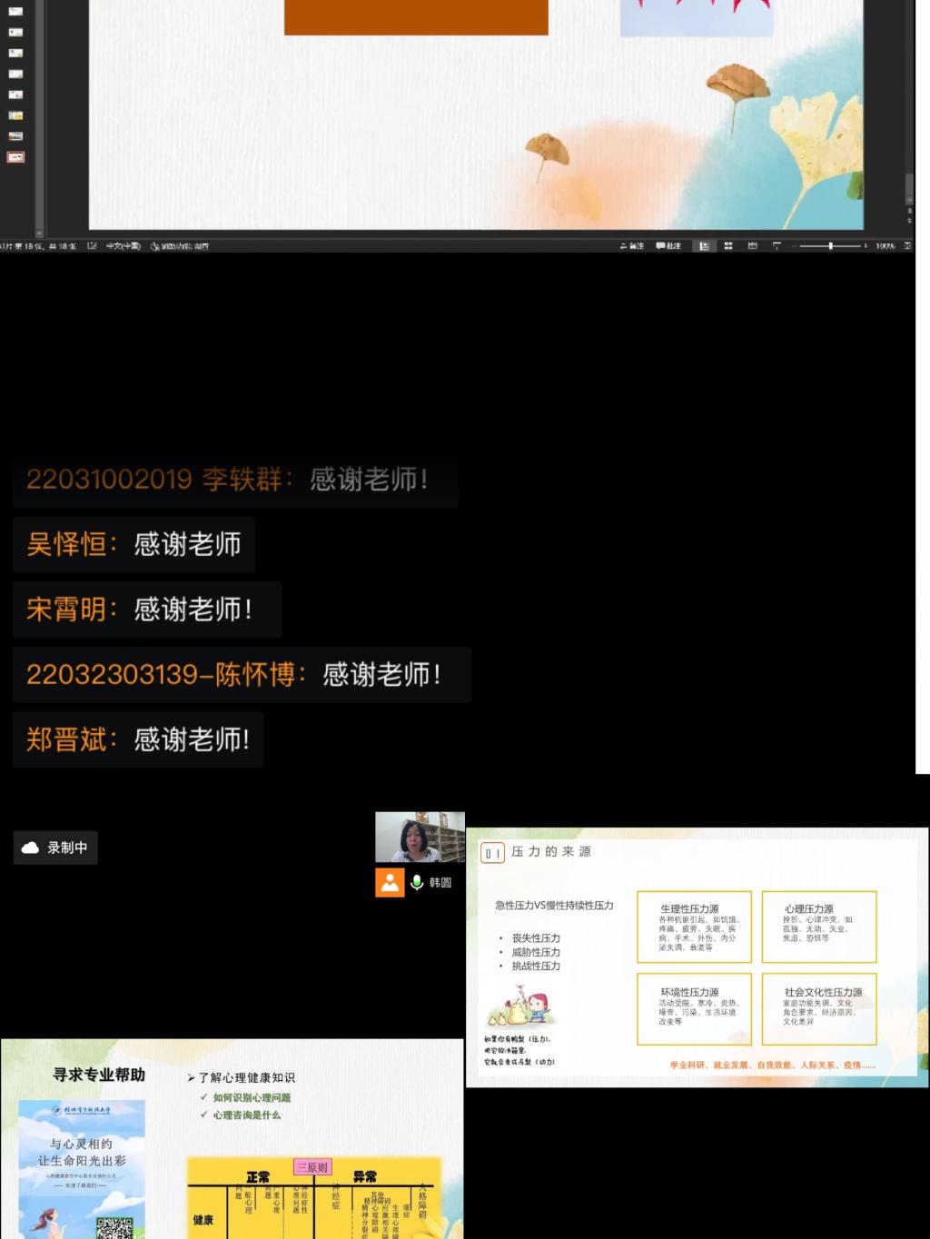 提高大学生心理健康教育是维持高校治安稳定的基础。韩老师分别向新生讲解压力的来源、以及如何寻求专业的帮助等方面进行心理健康教育和演示。在讲到如何预防心理问题时,韩老师通过举例高校真实案例、与同学们开展互动游戏等方式,向大家指出如何区别大学生的心理健康压力及心理问题。通过本次校园新生心理健康教育讲座,同学们的心理防线明显得到显著提高,同学们表示,会在今后的学习生活中学会抵制不良情绪、学以致用,保障身心安全。