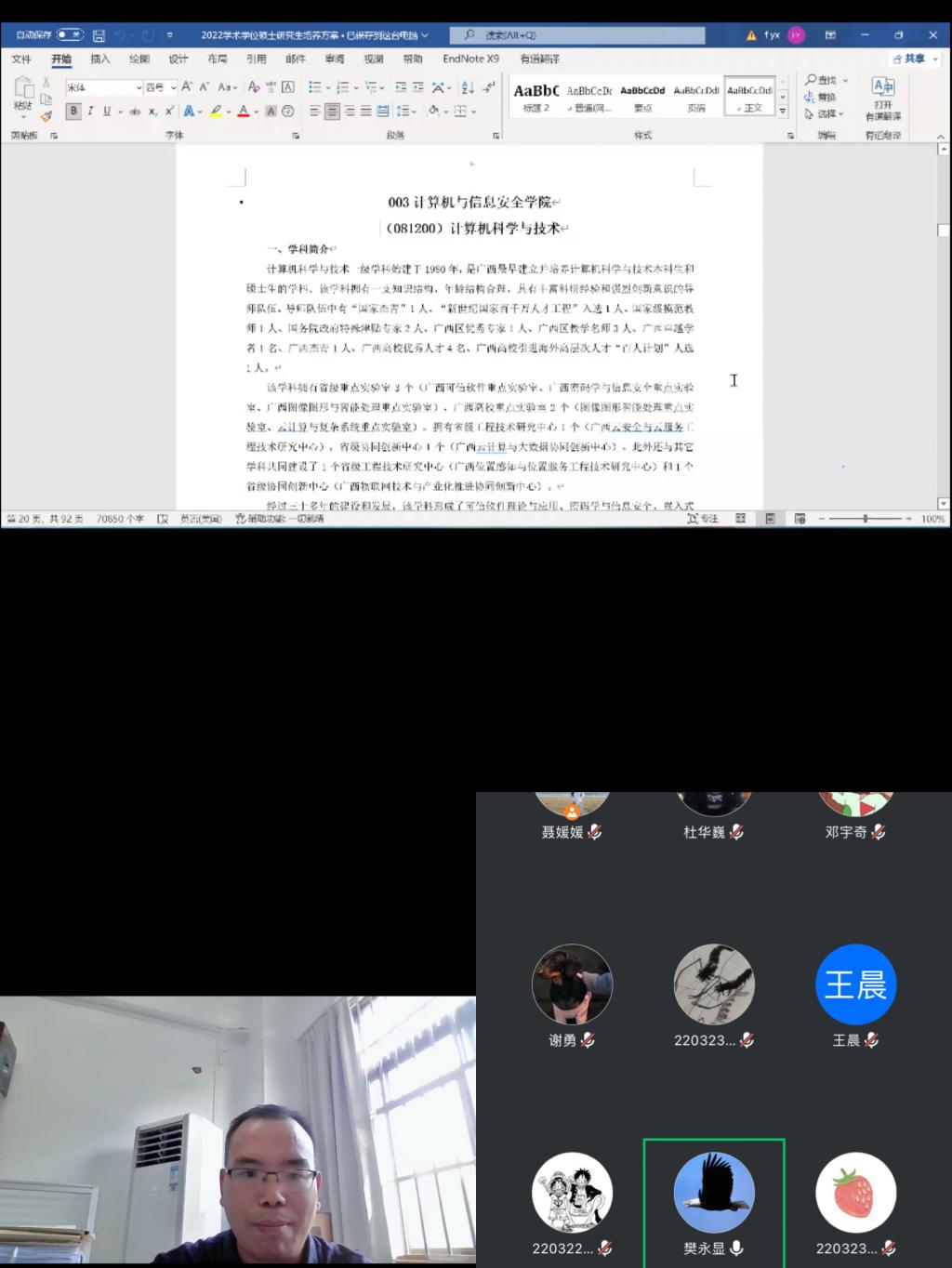 9月20日下午,计算机与信息安全学院在线上举行面向2022级研究生新生的培养过程解读讲座,本次讲座由学院院长助理樊永显老师主讲,研究生辅导员主持,全体2022级研究生参加。讲座上,樊老师分别向硕士生和博士生讲解了培养过程以及培养计划的主要内容。在讲到选课及学习讲座时,通过举例为大家指出两者的区别。通过本次讲座,同学们对自身的研究生生涯有了基本的了解。